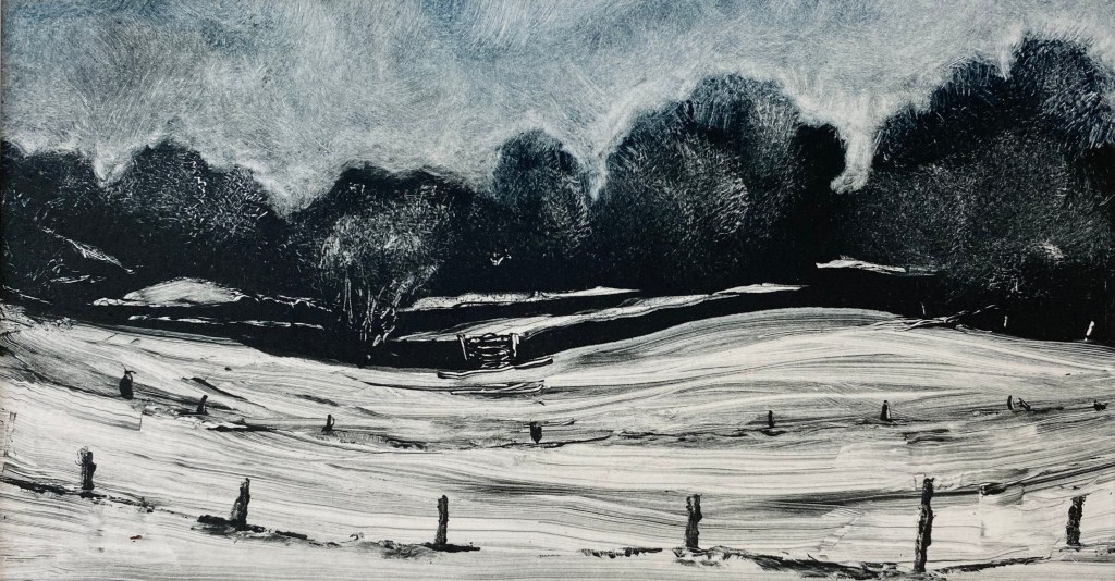 I would describe myself as a direct painter who likes to respond to a subject in an immediate and expressive manner. The atmosphere of the local Mendip landscape inspires me to make monochromatic drawings using charcoal or graphite. In recent years I have been exploring printmaking techniques, in particular monotypes, as a medium through which I can achieve the changing moods and wonderful contrasts of light and dark. In contrast, I have found that mark-making with vibrant pastels allows me to describe both the atmosphere of the Mendip landscape and the dramatic landscape of Dartmoor, which I also love, in a manner that suits the direct way I like to work.